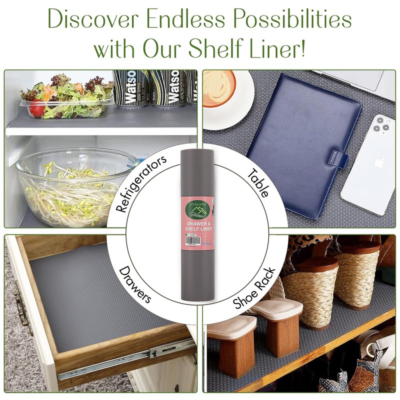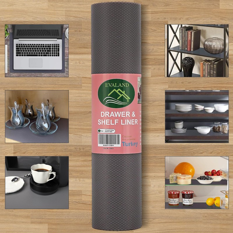 EVALAND 17.7 INCHES x 33 FEET (394 Inches) Non-Slip Shelf Liner, EVA Kitchen Liner, Non-Adhesive Liner, Smooth Drawer Liner, Durable Strong Grip Liner, Stain-Proof Shelf, Cabinet Liner, Grey