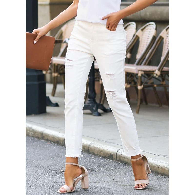 EVALESS White Womens Jeans Stretch Boyfriend Ripped Distressed Frayed Raw Straight Ankle Hem Denim Pants Tummy Control Size 12