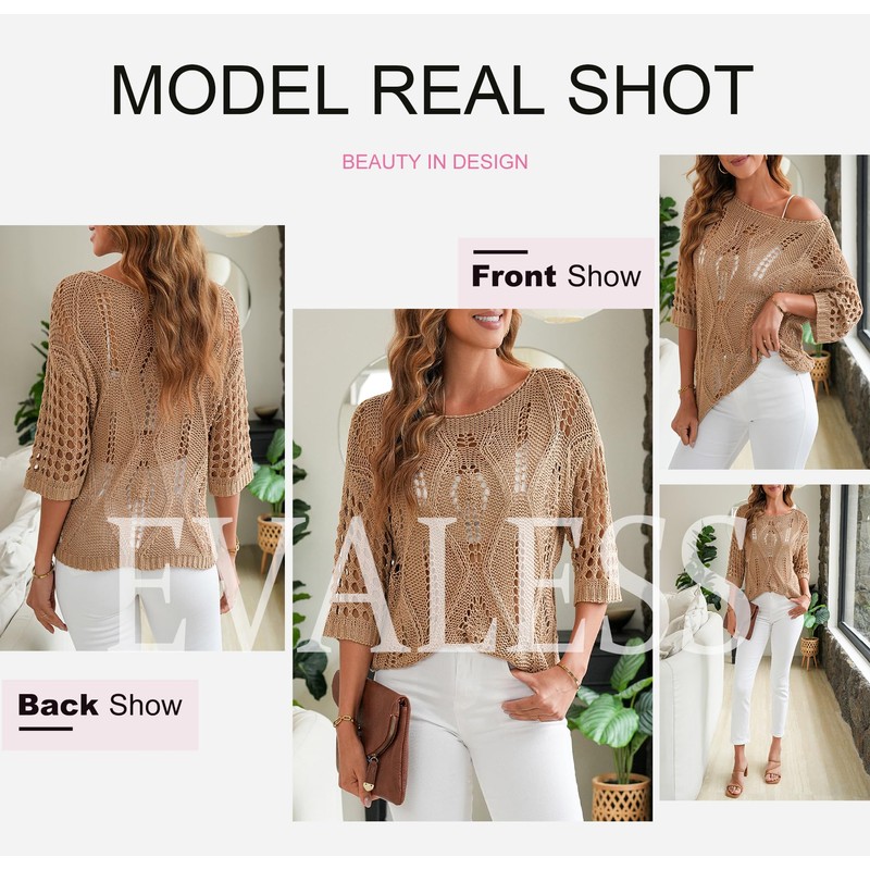 - EVALESS Women's 2025 Spring Summer Crochet Hollow Out 3/4 Sleeve Pullover Sweater Off Shoulder T-Shirts Off Shoulder Tops for Women Bathing Suit Cover Up for Women