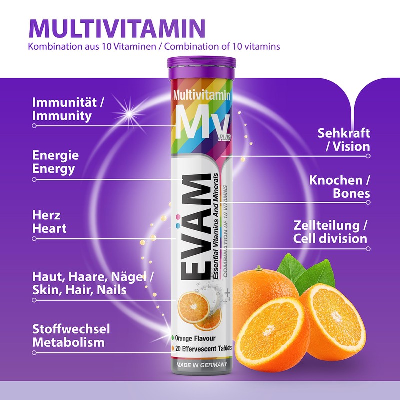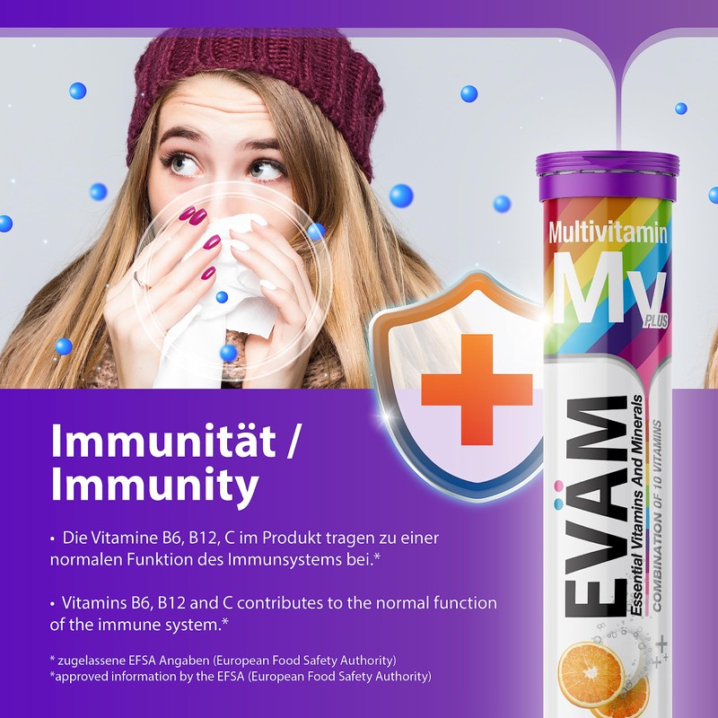 - A EVÄM multivitamin effervescent tablet daily covers the daily requirement of 10 important vitamins.