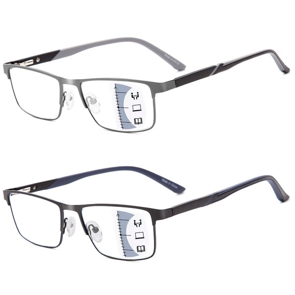 EVANLCAP Premium 2 Pack Multifocus Progressive Reading Glasses Men, Blue Light Blocking Multifocal Readers No Line Bifocal Glasses Spring Hinge (Workspace for Near Range, 1.0x)