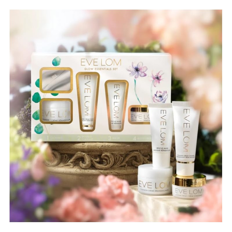 EVE LOM Glow Essentials Set | Includes Cleanser 20ml + half Muslin Cleansing Cloth, Foaming Cream Cleanser 20ml, Rescue Mask 15ml, & Moisture Cream 15ml - 5 Piece Set