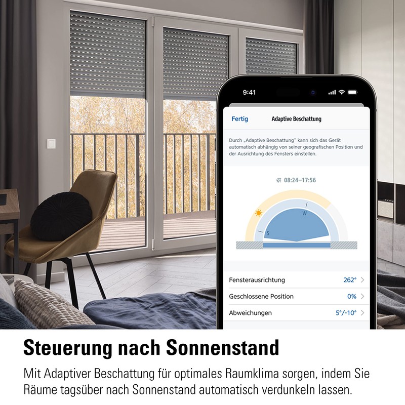 - Adaptive shading for a pleasant indoor climate thanks to automatic control according to the position of the sun.