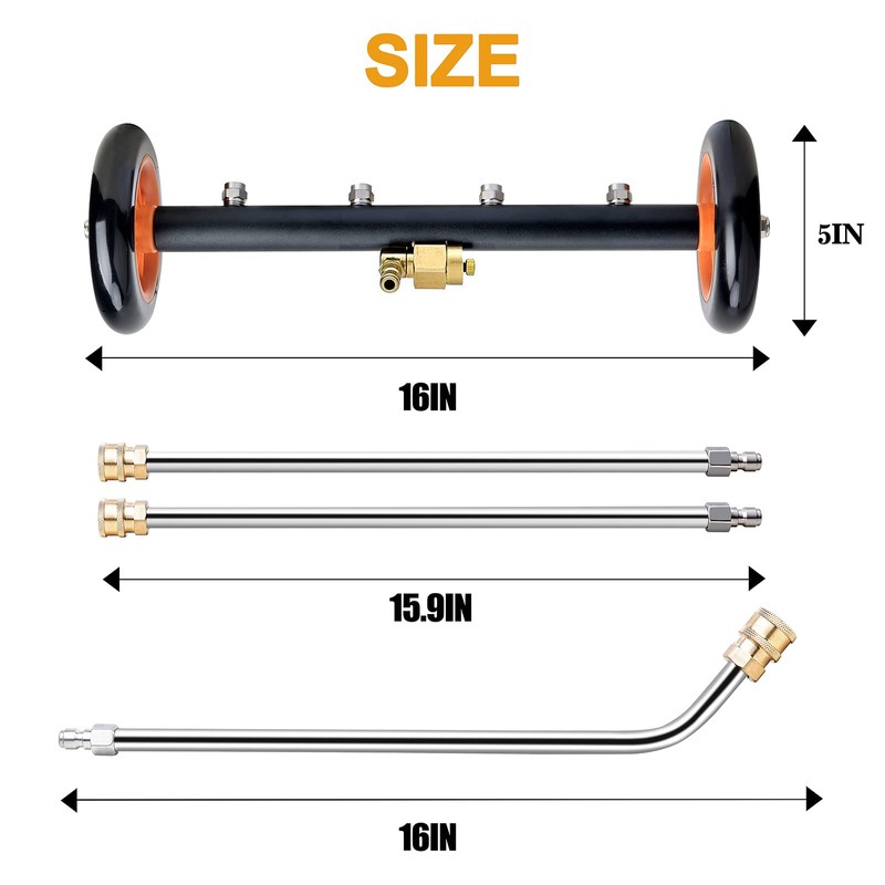 - Best Choice for Self Use or Present!: Undercarriage power washer attachment is very high and built to last, you'll know when you hold it. 4 stainless nozzles provide high water pressure and precise water flow even for Lawn Irrigation, two cool rubber wheels can fit in tight spaces for complete cleaning. 16" portable size for easy store