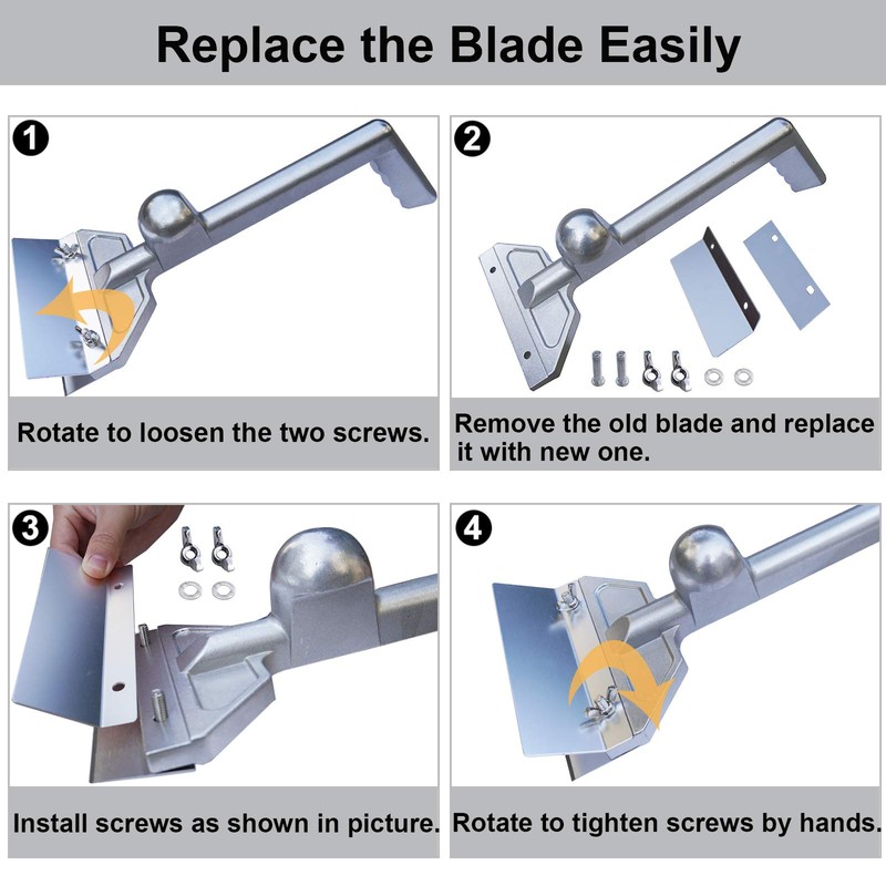 - ★ EASY TO USE AND CLEAN: When replacing the blade for the long grill scraper, simply loosen the screws and replace it with a new one by hands. If use the heavy duty scraper for grill frequently, recommend to replace the blade once a month. When cleaning the aluminum scraper, remove the blade and use detergent and hot water to clean.