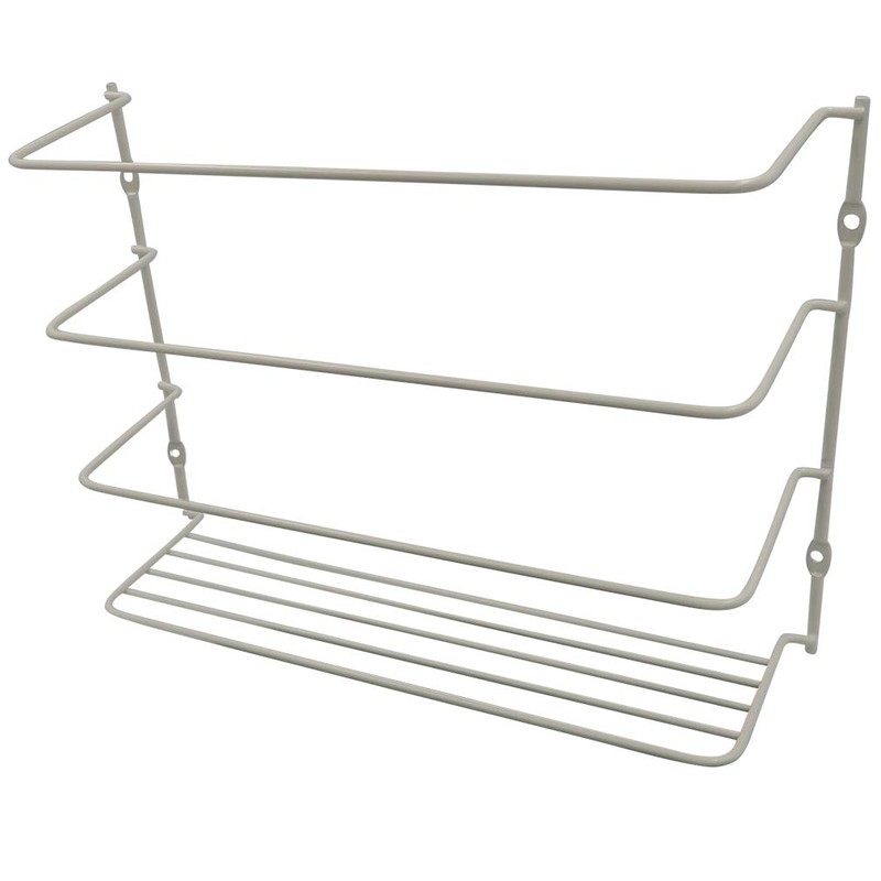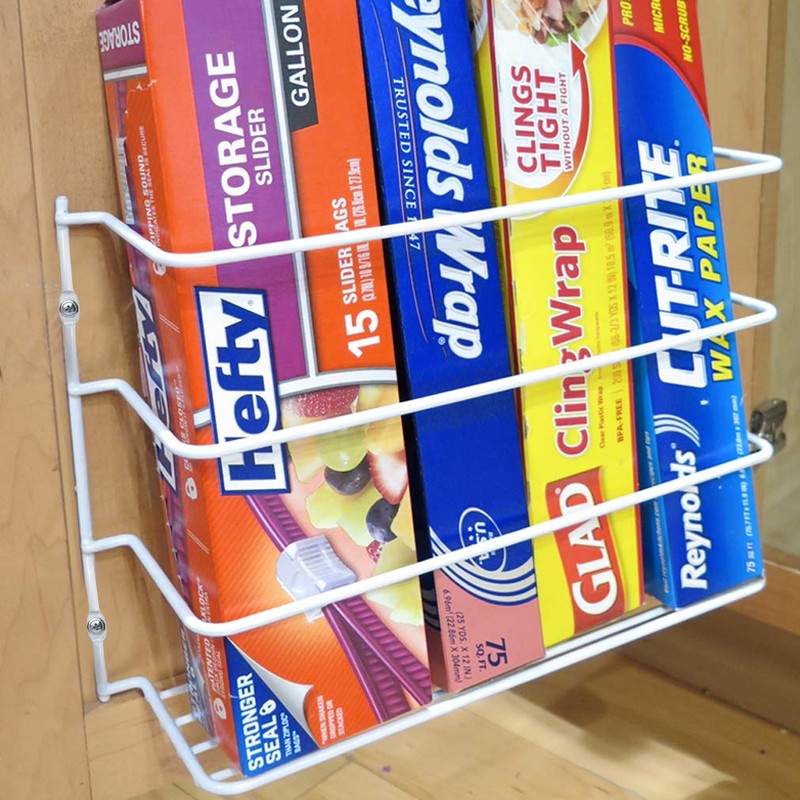 - This space saver is great for organizing your plastic wrap, foil, wax paper, sandwich bags and much more! Mount to wall, pantry, cabinet, or wherever convenient. Made of sturdy, white, plastic coated iron that will not rust.