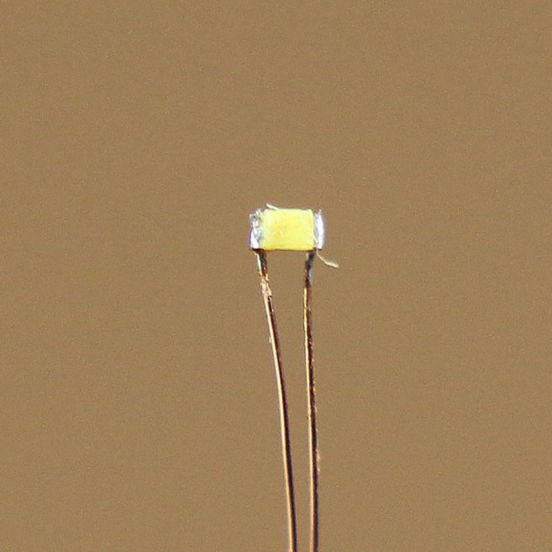 - For utmost miniaturization, magnet (copper) wire with only 0.1 mm in diameter (cross sectional area 0.008 mm2) is used, wafer-thin and ultra-flexible, but still covered with an electrical-isolating clear lacquer coating.The wire length is about 200 mm. For easy recognizable connecting, the Cathode is about 10 mm shorter than the Anode.
