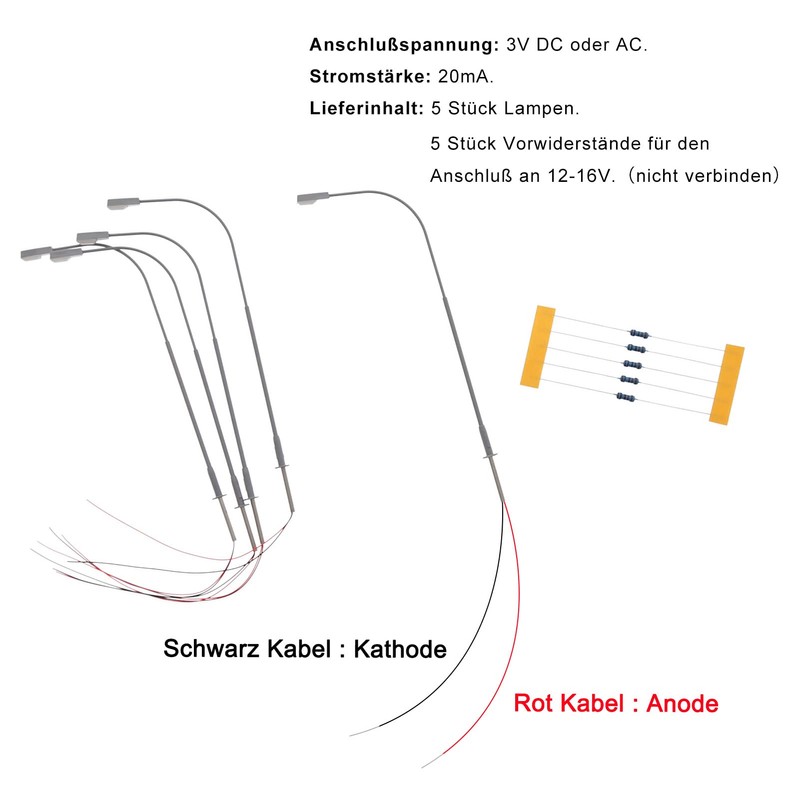 - Box contents: 5 lamps (with lampshade). & 5 pieces of series resistors for connection to 12-16V.