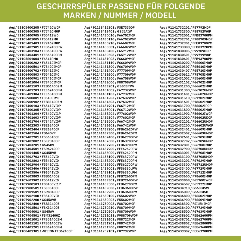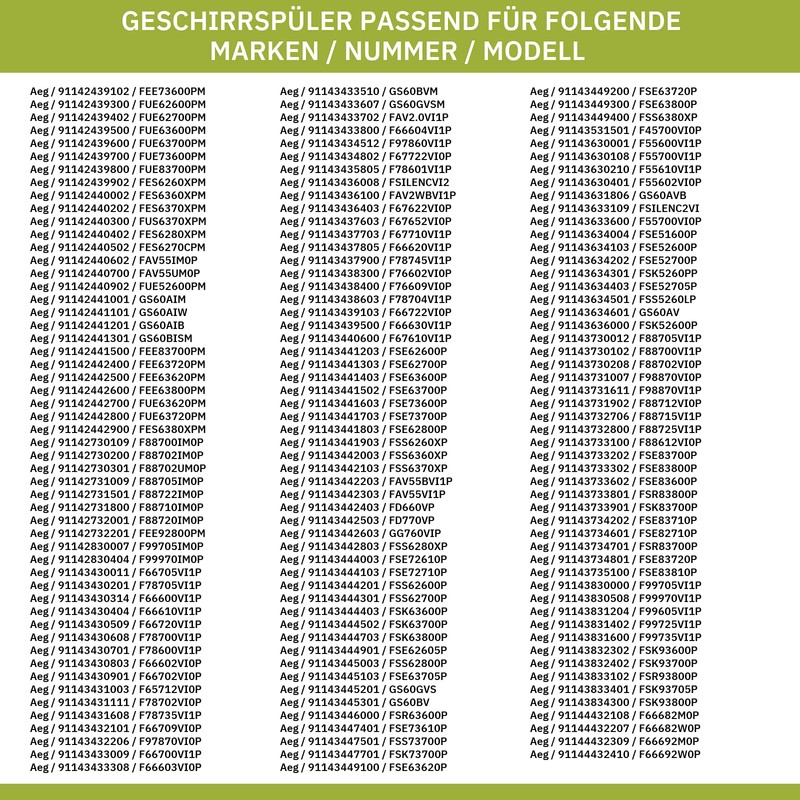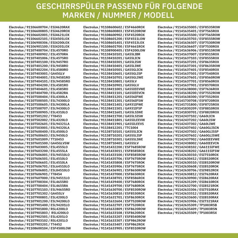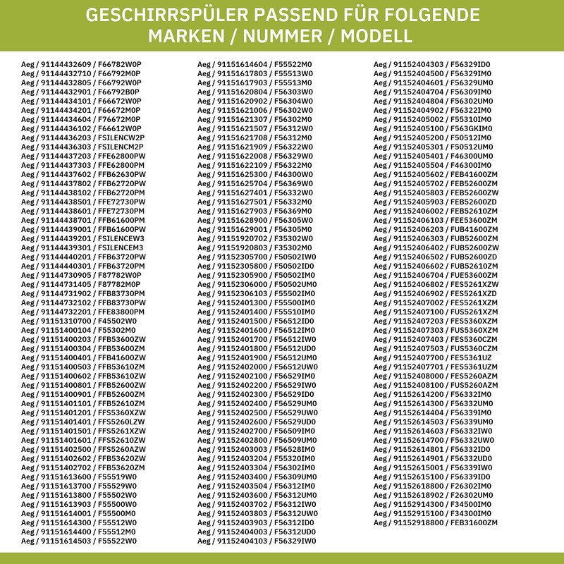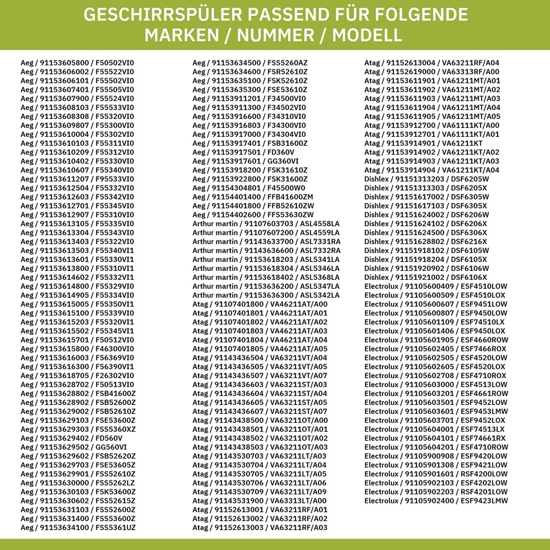 - Perfect fit: compatible with devices of the following brands: AEG, ARTHUR MARTIN, ATAG, DISHLEX, ELECTROLUX, ELEKTROHELIOS, FAURE, FORS, FRIGIDAIRE, HUSQVARNA, IKEA, JOHN LEWIS, JUNO, KüPPERSBUSCH, LEONARD, NEE, PELGRIM, PROGRESS, REX, Rosenlew