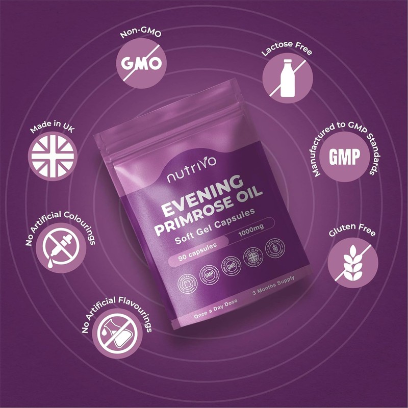Evening Primrose Oil 1000mg | 90 Capsules | High-Strength Cold-Pressed with Rich GLA (Omega-6) | Made in the UK | Convenient Pouch Packaging