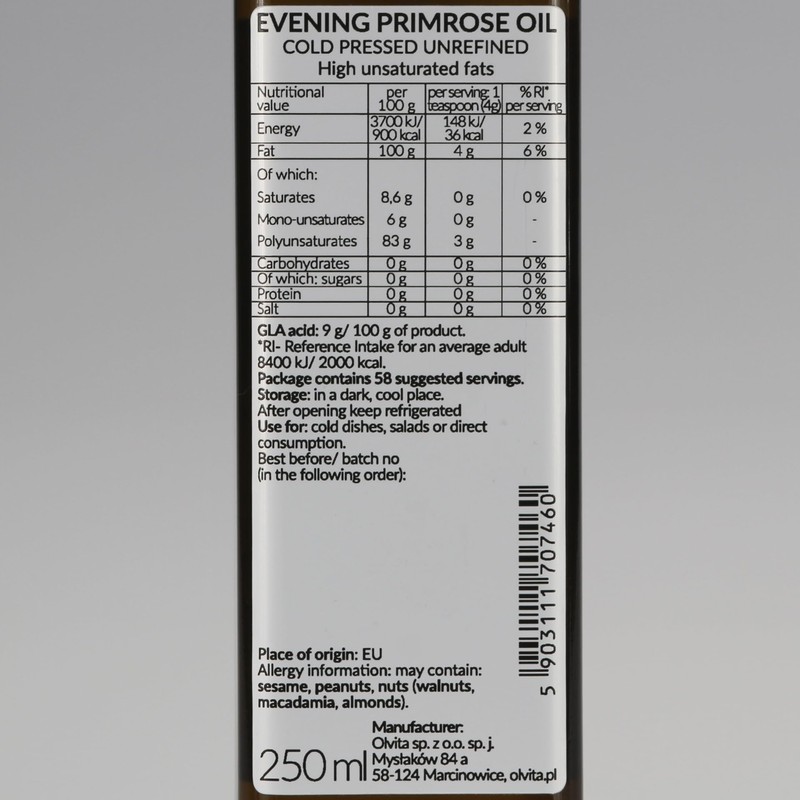 Evening Primrose Oil has a delicate taste and lightly yellow color. Perfect as an addition to salads. It is recommended to consume 1 teaspoon a day. Keep refrigerated after opening.