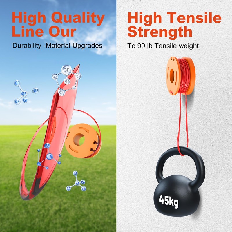 • The unique shape for worx trimmer string reduces drag,allowing for more efficient cuts,provide a wider range of mowing. Plus, its pliable and flexible design allows it to stretch and cushion on impact, Longer service life. worx String Trimmer Spool Auto Feed System to feed the trimmer line as it is needed, eases the tedious work of hand-winding spools.