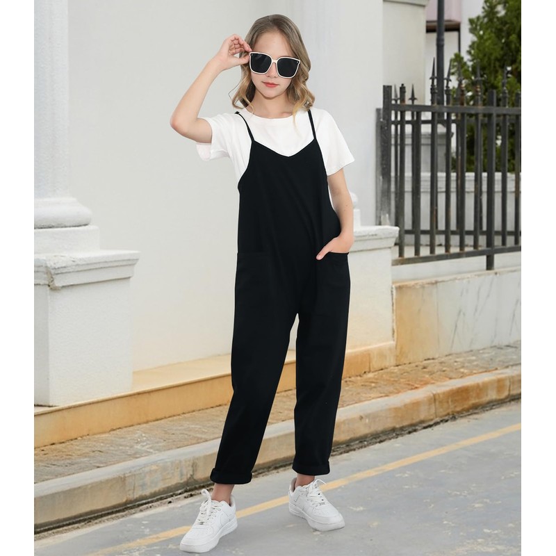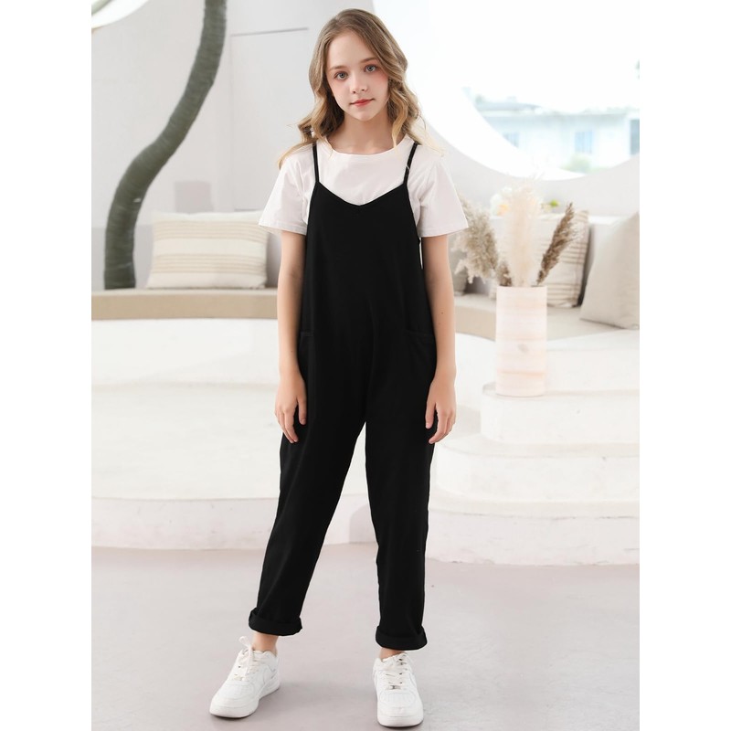 Evensu Girls Casual Sleeveless Romper Black Jumpsuits Size 8-10 9 Spaghetti Strap Overalls Loose Summer Clothes Long Pants With Pockets