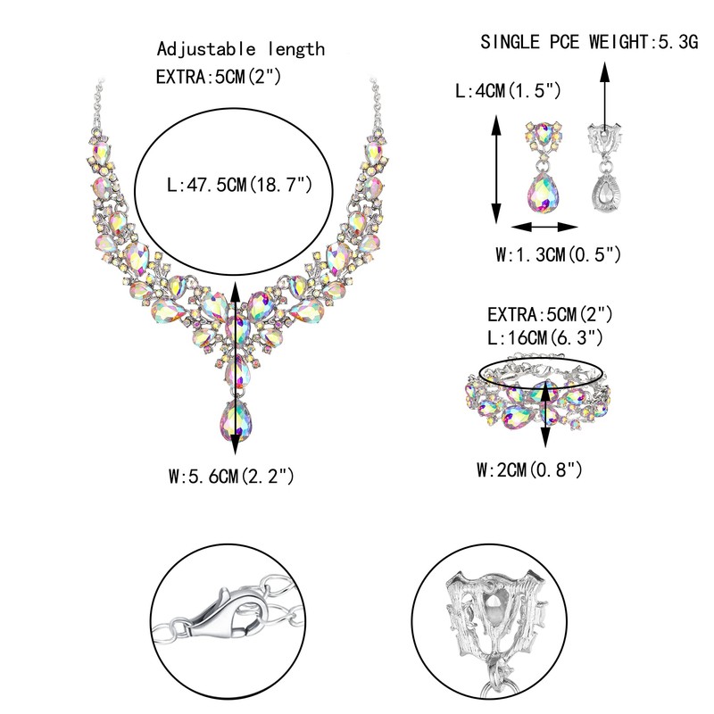 - Necklace Adjustable Chain Length: 47.5cm(18.7")-52.5cm(20.6"), Attachment Size: 5.6cm(2.2")by18.5cm(7.3"), Earring Size: 4cm(1.5")by1.3cm(0.5"),Adjustable Bracelet Length: 16cm(6.3")-21cm(8.2"); Total Weight: 70g, For Pierced Ears Only.
