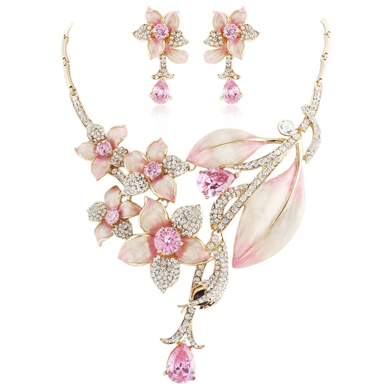 EVER FAITH Hibiscus Leaf Necklace Earrings Set Cubic Zirconia Crystal Pink Gold-Tone