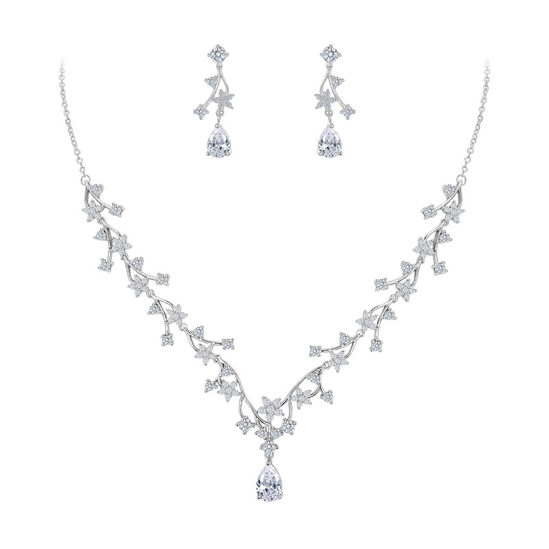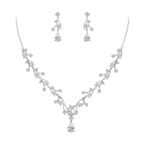 EVER FAITH Juego de joyería para Banquete de Boda para Novia, Lágrima Blanca Corte Redondo CZ Racimo de Flores Collar de Vid Conjunto de Pendientes Tono Plateado