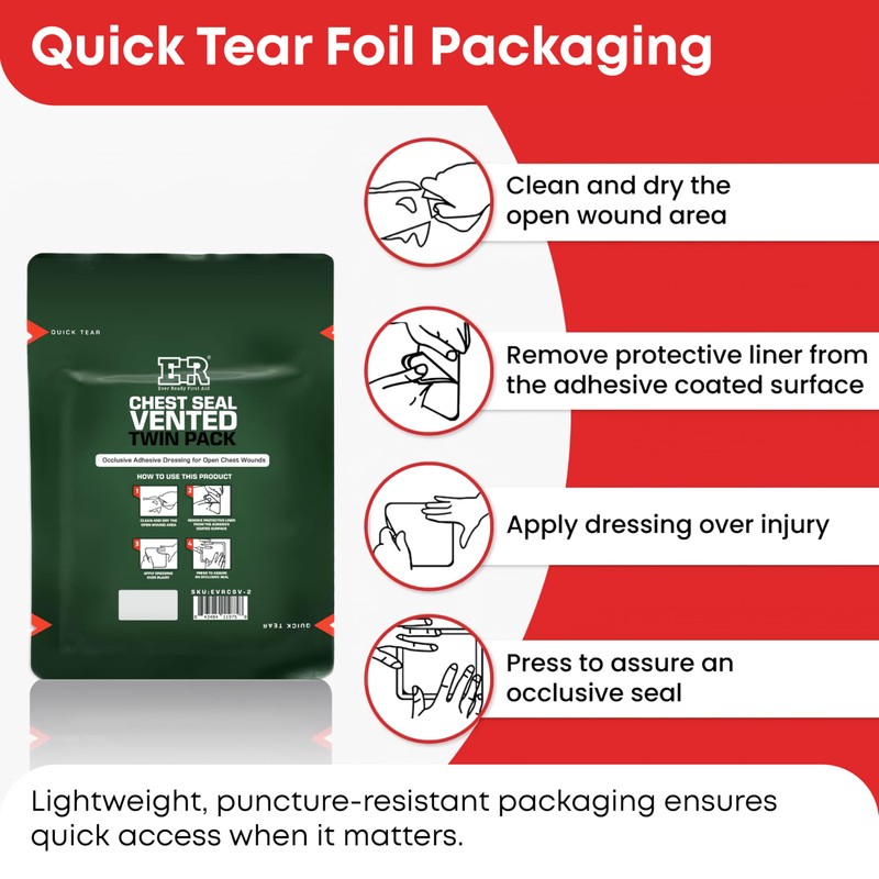 - INDIVIDUAL FOIL POUCHES WITH QUICK TEAR – Each chest seal comes individually packaged in vacuum-sealed, puncture-resistant pouches with Quick Tear, allowing for rapid access in emergency situations.