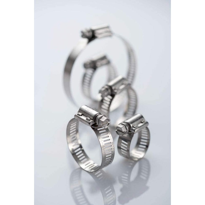 Material: band, housing, & screw all are made of 300-grade stainless steel. Size: #28, 1-1/4"~2-1/4" diameter range, 1/2" bandwidth, 5/16" hex. screw. Package: 10 pcs hose clamps in a box.