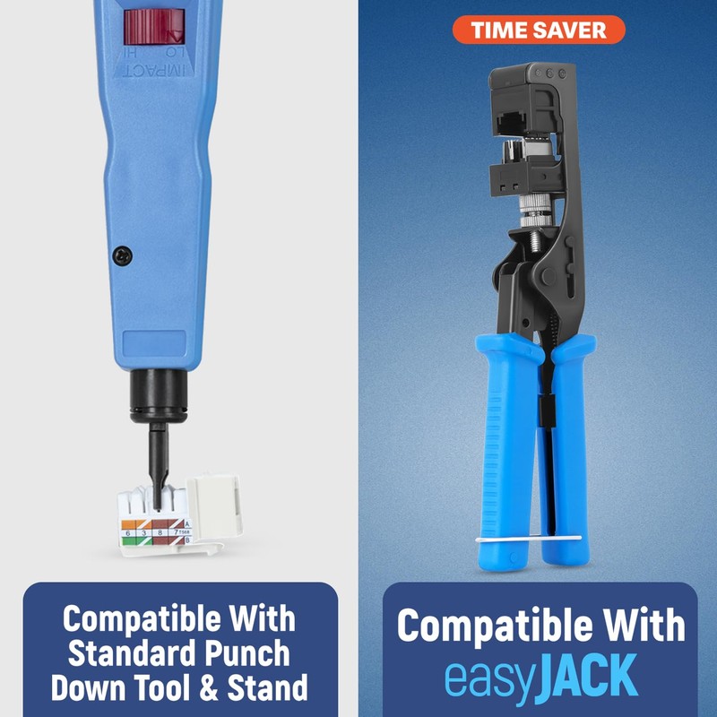 • Compatibility - compatible with our 90 degree angled speed termination tool - easyJACK (B094WB91H3). These cat 6a jacks keystone rj45 can also work in conjunction with a standard punch down tool and punch down stand for convenience.