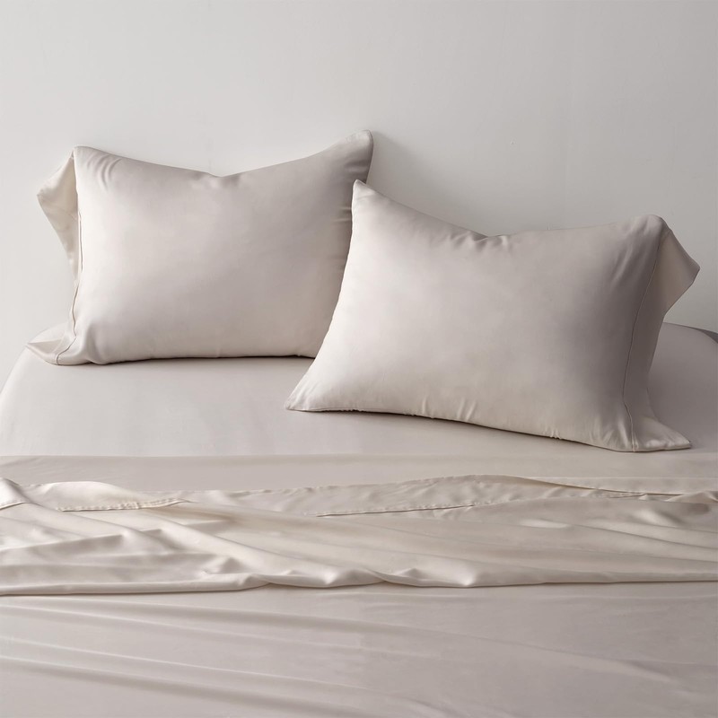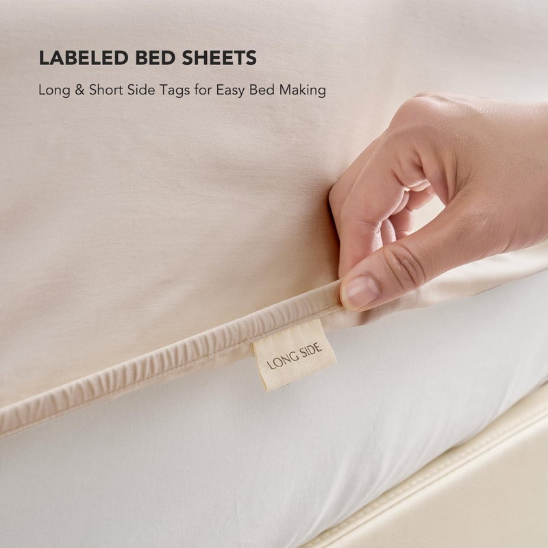 - ENDURING QUALITY - Crafted from imported Lenzing TENCEL using a sateen weave process, our queen sheet set ensures a silky-smooth texture with a glossy sheen that exudes opulence and prevents friction against skin and hair. The fitted sheet, featuring convenient short/long side tags and a deep pocket accommodating mattresses up to 16 inches, ensures effortless bed making. This set includes a flat sheet (90''x102''), a fitted sheet (60''x80''+16") and two pillow shams (20''x26''+4").