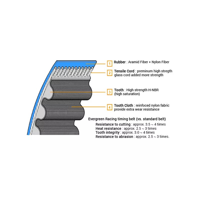 Evergreen Racing® Timing Belts are designed from high quality materials to give improved durability as well as reduced stretch degradation. The superior construction of Evergreen Racing timing belts makes them 3 times stronger than the standard aftermarket belt while providing up to three times resistance to heat and abrasion.
