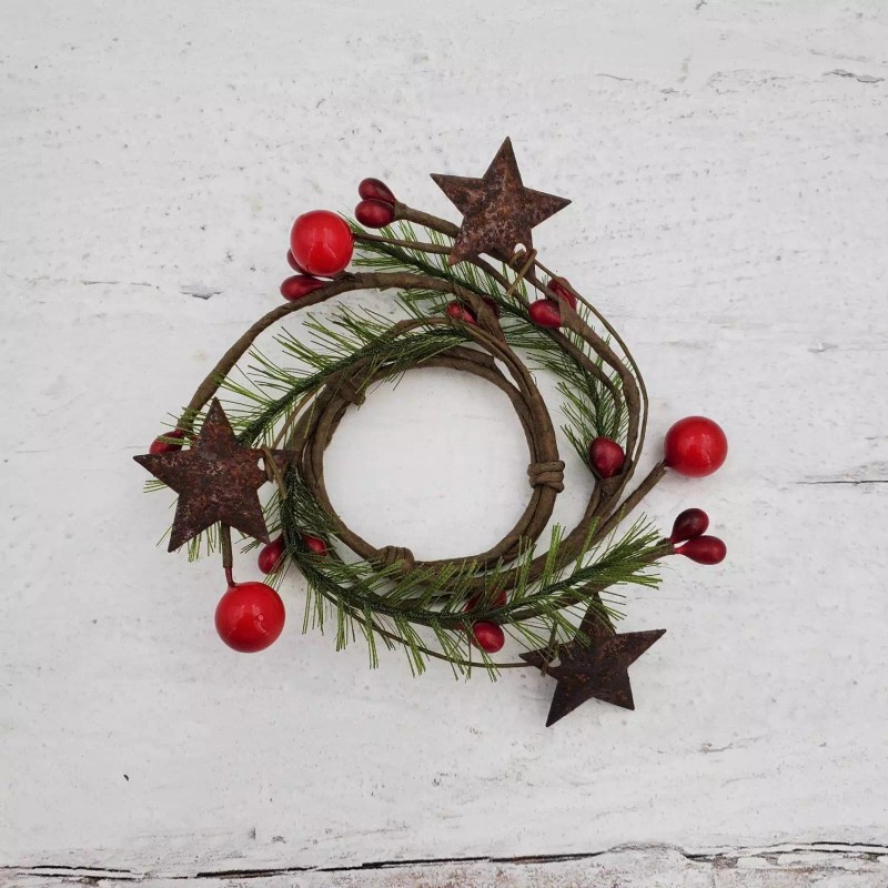 Evergreen Red Berries with Rusty Stars Small Pip Berry 1.25" Taper Candle Ring
