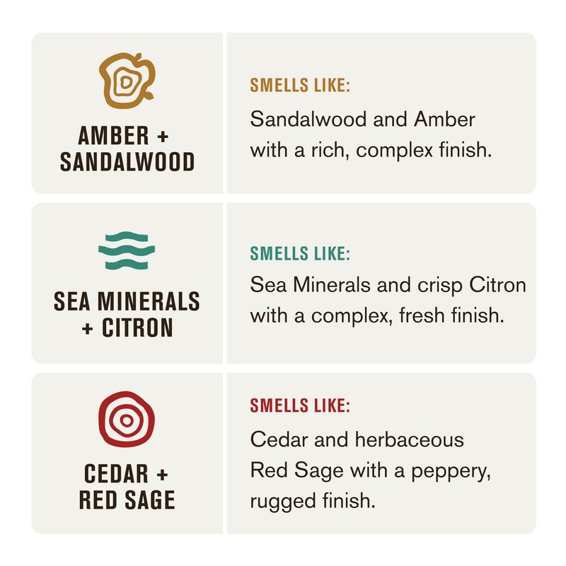 - OUTDOOR INSPIRED SCENTS: Sandalwood and Amber with a rich, complex finish; Sea Minerals and crisp Citron with a complex, fresh finish; Cedar and herbaceous Red Sage with a peppery rugged finish