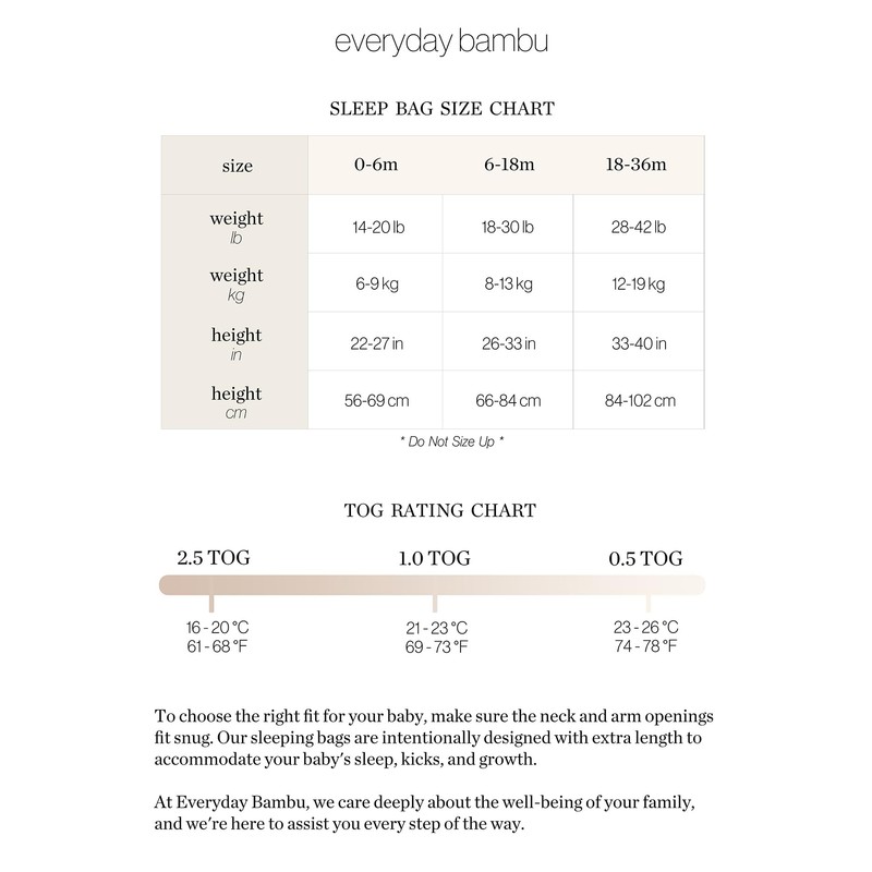 - Warmth for All Seasons: With TOG ratings of 0.5, 1.0, and 2.5 TOG sleep sack options, the Everyday Bambu Sleep Bag for Baby adapts to any climate. From sleep sack 0-3 months to sleep sack 18-36 months or toddler sleeping sack, it provides your baby's comfort through warm weather and cold, making it a staple among baby essentials and baby stuff.