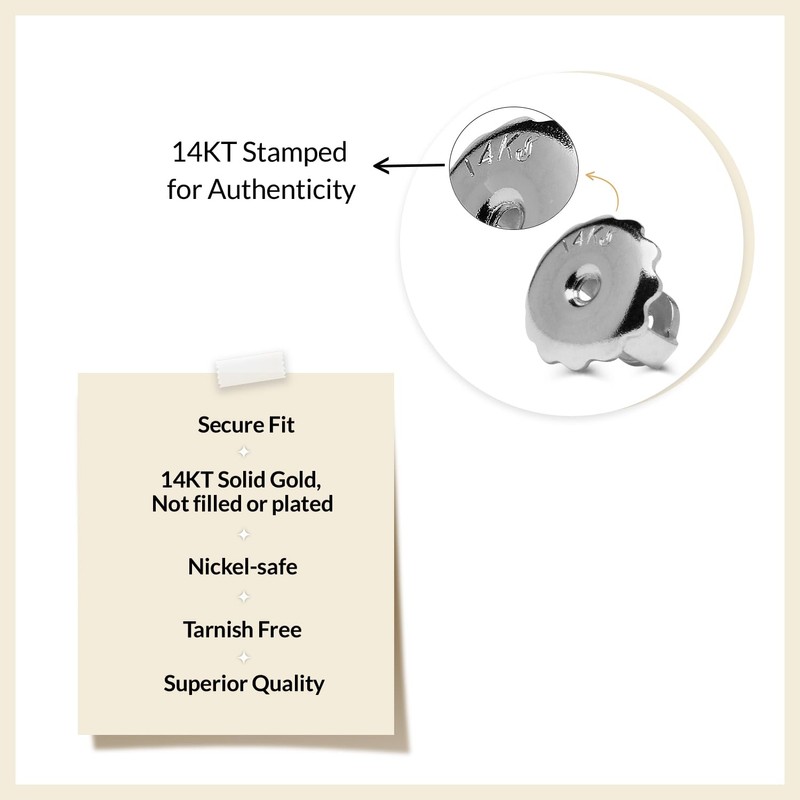 • SAFE MATERIALS: Nickel-safe for sensitive skin, our replacement earring backs are made solely from solid 14K White Gold. We assure that no other metals are mixed in our product. This commitment to consistent gold quality ensures that those with metal allergies won't react to our earring backs.
