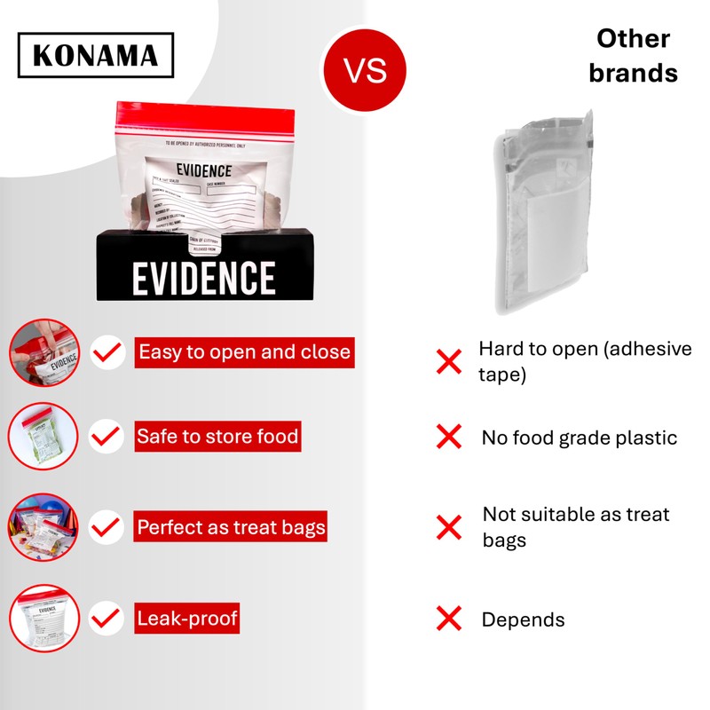 - Made from high-quality food-grade plastic, these Evidence Bags serve a dual purpose as impeccable food storage containers.