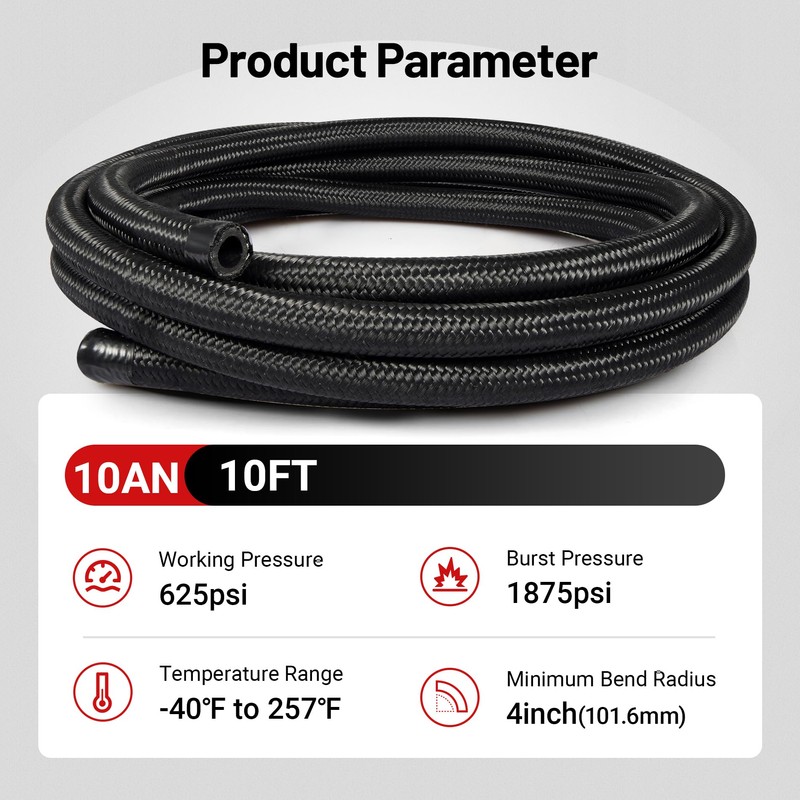 - [Maximum Working Pressure] This 10an braided fuel line can stand high pressure, with long-lasting lifespan. Maximum working pressure: 625psi; bursting pressure: 1875psi; temperature Range: -40℉ to 257℉.