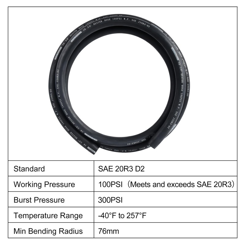 - [Parameter] Working Pressure: 100psi; Burst Pressure: 300psi; Temperature Range: -40°F to 257°F; Min Bending Radius: 76mm. Meets and exceeds SAE 20R3 Standard Wall Class D-2 requirements.