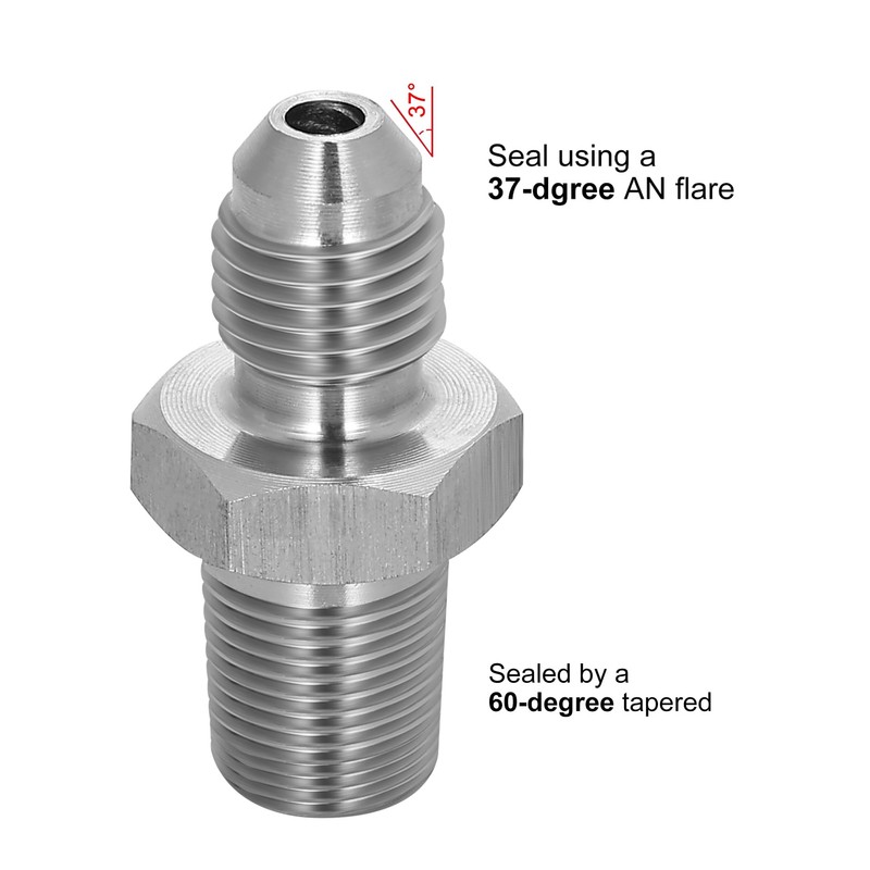- [Sealing] The AN side of the flare is sealed by a 37 degree angle and the NPT thread side is sealed by a 60 degree tapered thread.
