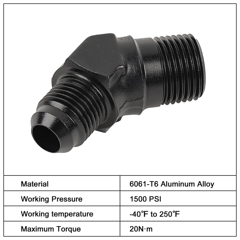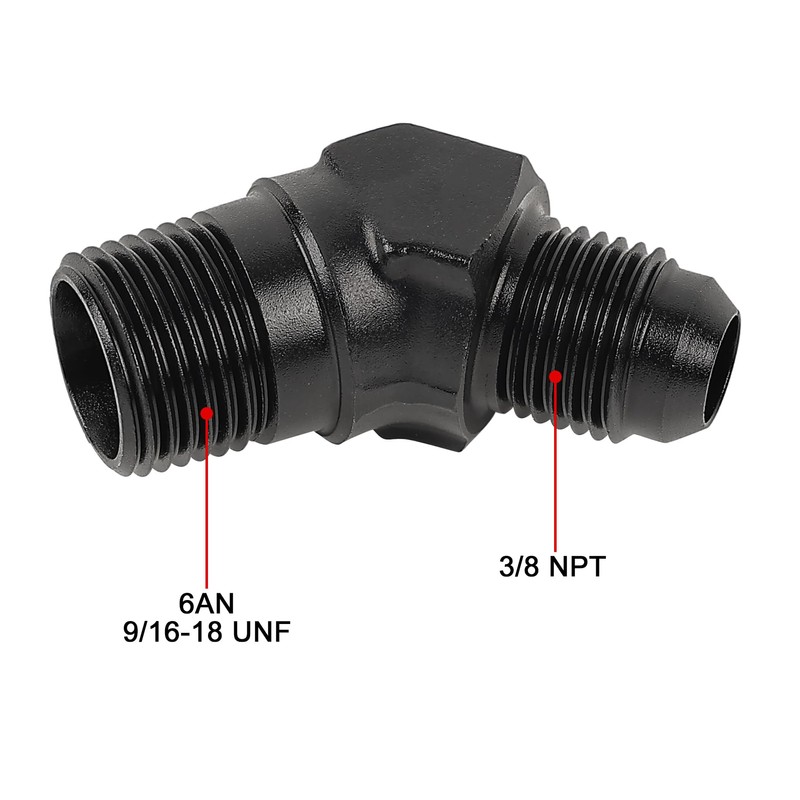 - [Size] 3/8" NPT to AN6, the thread size of 6AN is 9/16-18 UNF, Degree: 45 degree elbow.
