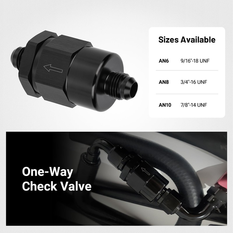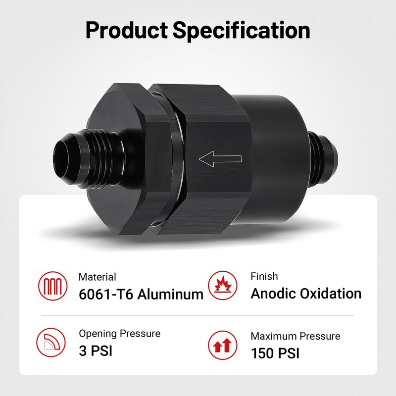 - Material: Made of high-strength 6061-T6 aluminum alloy, the check valve is black anodized for enhanced corrosion and wear resistance.