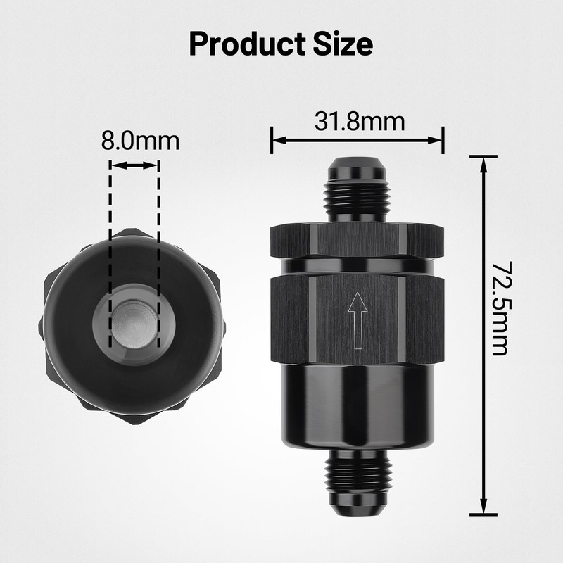 Evil Energy’s non-return fuel check valve is manufactured with lightweight, high-strength 6061-T6 aluminum alloy, while the black anodizing finish adds strength, corrosion, and wear resistance. This fuel line check valve equips an FKM O-Ring for a leak-free seal and 304 stainless steel spring for reliable performance. It features a piston that delivers an optimum flow with minimal restriction and pressure loss, allowing flow in a single direction only and preventing backflow.
