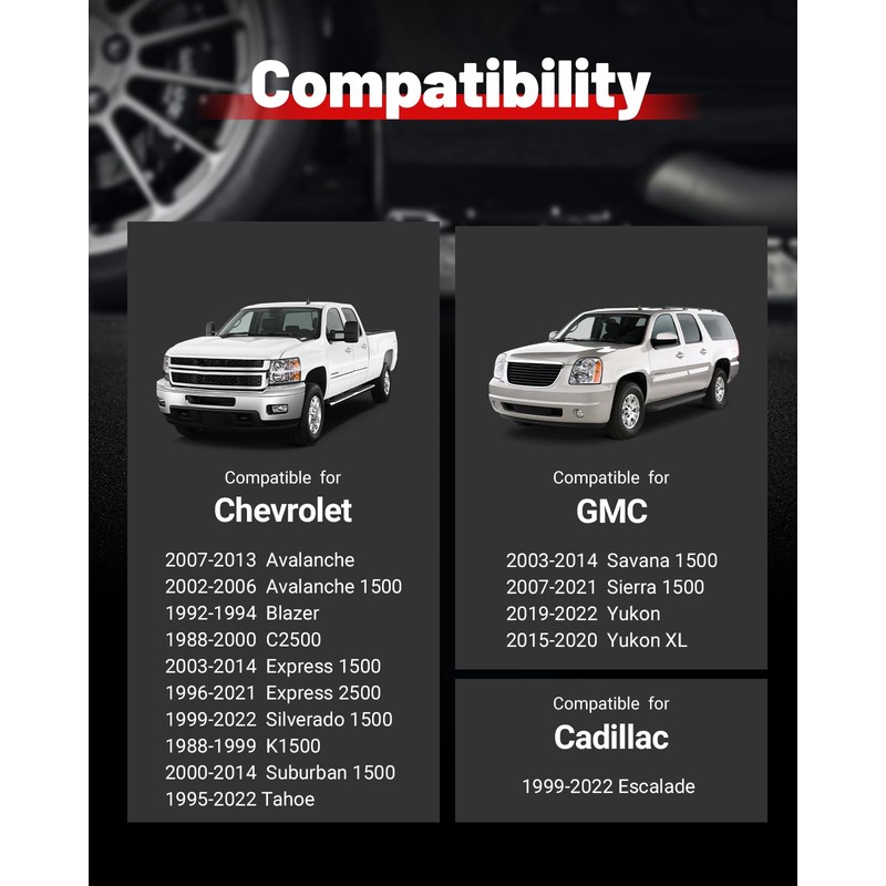- Compatibility: Compatible for Chevrolet 2007-2013 Avalanche, 2002-2006 Avalanche 1500, 1992-1994 Blazer, 1988-2000 C2500, 2003-2014 Express 1500, 1996-2021 Express 2500, 1999-2022 Silverado 1500, 1988-1999 K1500, 2000-2014 Suburban 1500, 1995-2022 Tahoe. For more models, please check the product images