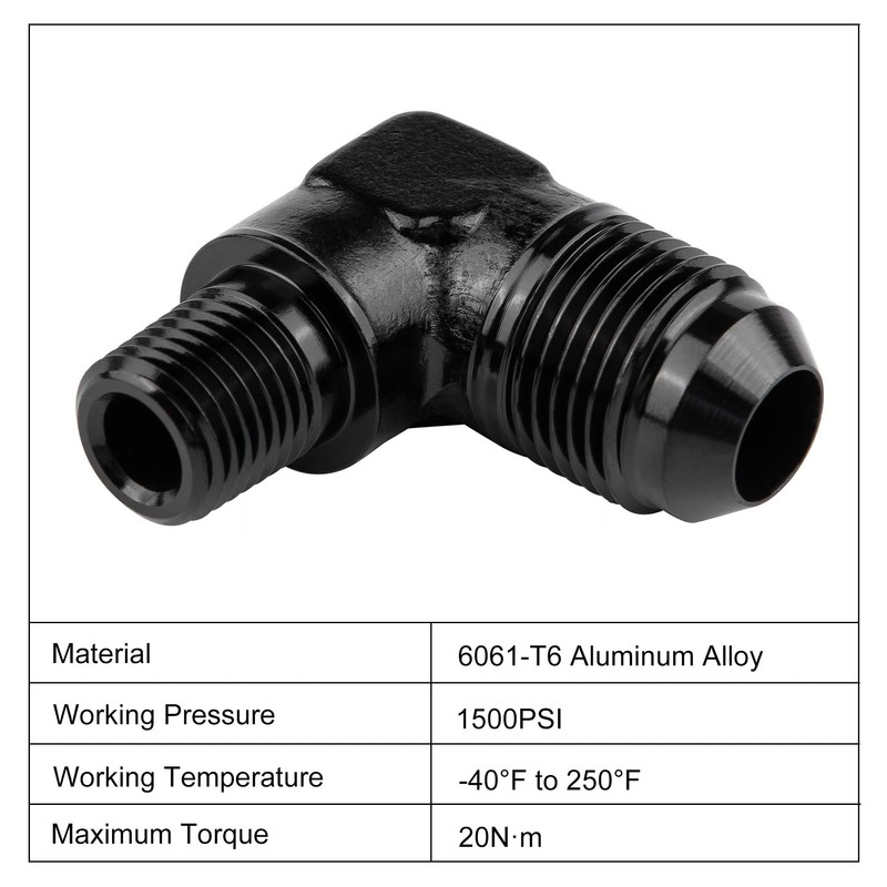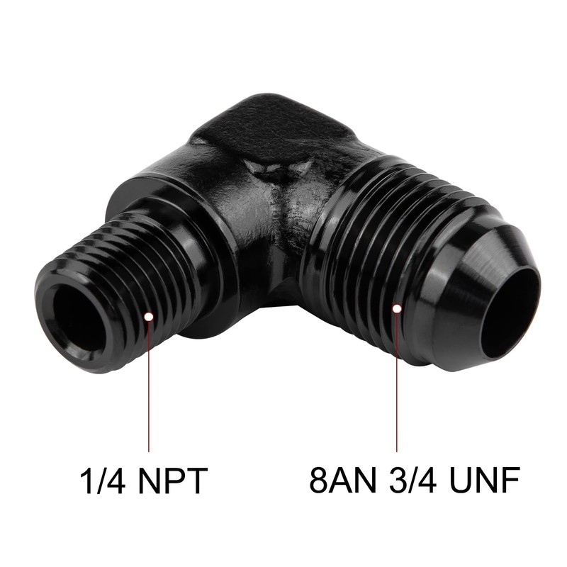 - Size: 8AN flare to 1/4" NPT, the thread size of 8AN is 3/4-16 UNF, Degree: 90 degree elbow