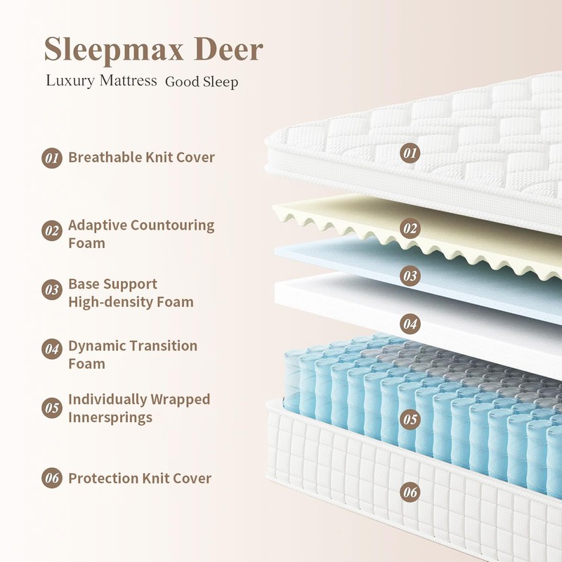 • Pressure-Relieve Comfort:To better cradle your every body curve and provide cushioning support, countouring foam and supportive foam are quilted into the breathable knit cover. Three layers of foam won't let you know feel the beneath coils. Foam and innersprings work in tandem to provide targeted support for kids, heavy people, adults and elderly, relieving pressure points at your shoulders, hips, and legs.