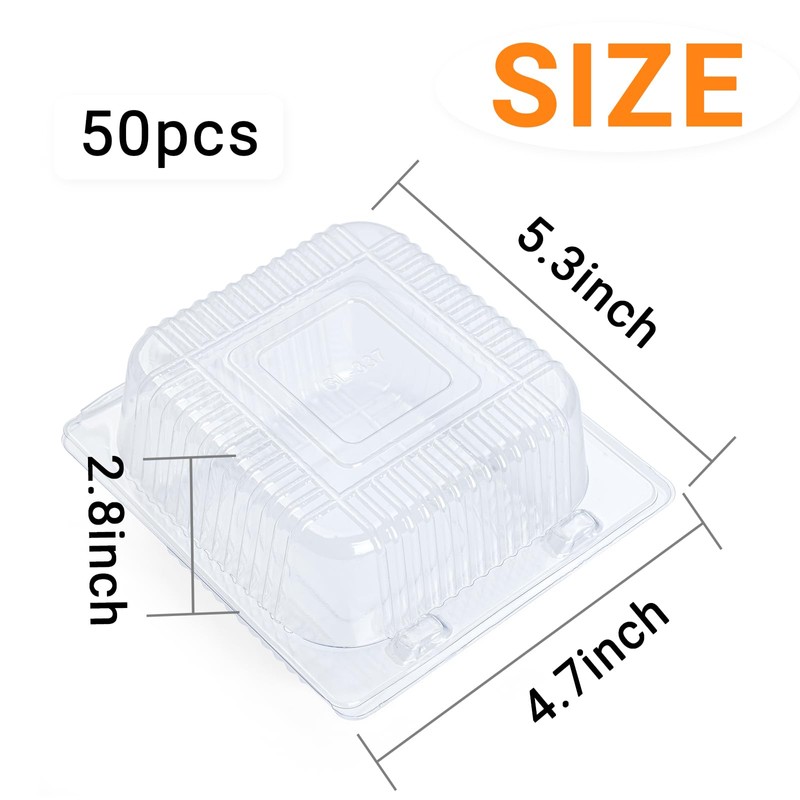 • 50-Pack Clear Hinged Clamshell Containers: Includes 50 transparent plastic containers with secure hinged lids, ideal for showcasing and transporting a variety of foods such as desserts, sandwiches