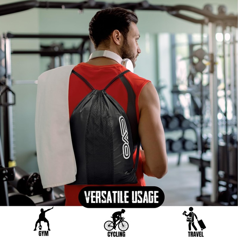 EVO Fitness Drawstring Bags - Lightweight Gym Backpack Men, Ideal for Gym Travel and Cycling Durable Mesh Material wiht Adjustable Shoulder Straps Drawstring sports bag (Black)
