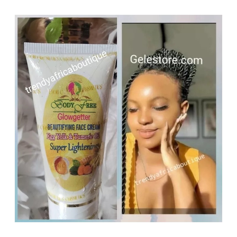 Evob body free glow getter face cream with egg yolk and turmeric is a formula for lightening dark spots. Super lightening. Apply to face after wash.