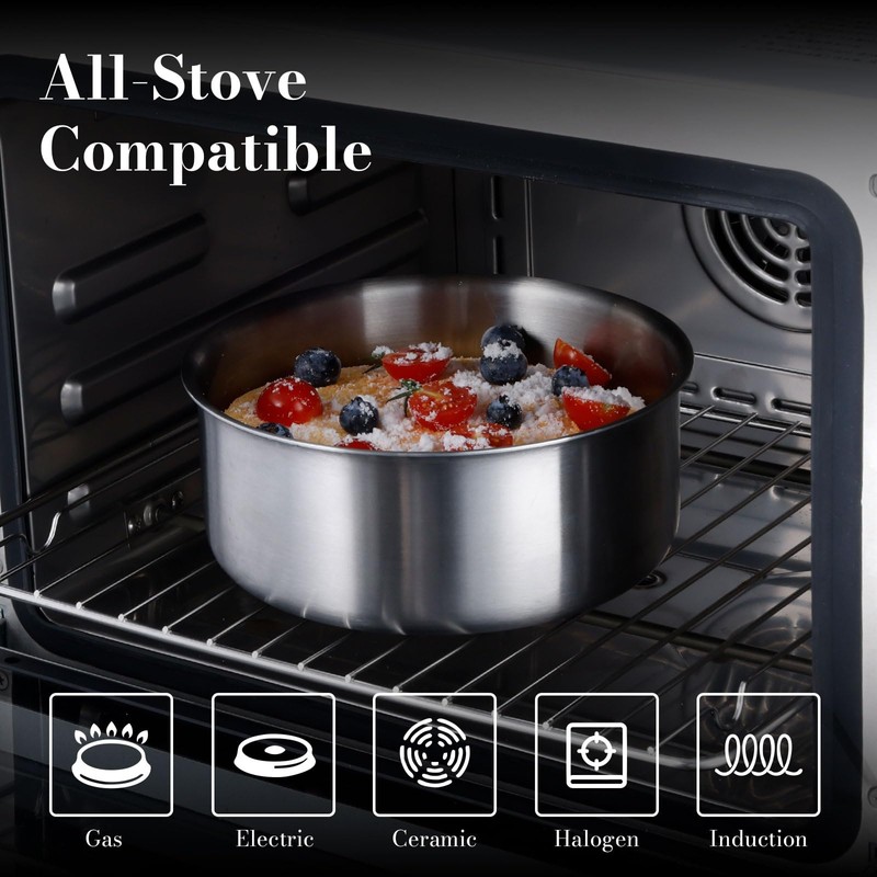 • Tri-Ply Construction for Even Heating: Each stainless steel pan features full tri-ply construction—an aluminum core between stainless steel layers from base to rim—for fast, even heat distribution and excellent retention. No hot spots or uneven cooking.