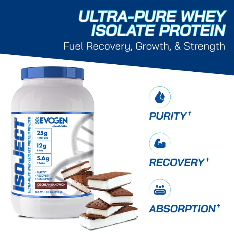 Evogen Isoject - Whey Protein Isolate | Ultra-Pure Whey Protein Powder with Ignitor Enzymes, BCAAs, and EAAs | Enhanced Absorption & Recovery | Ice Cream Sandwich | 25 Servings
