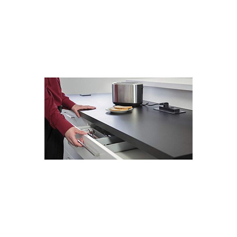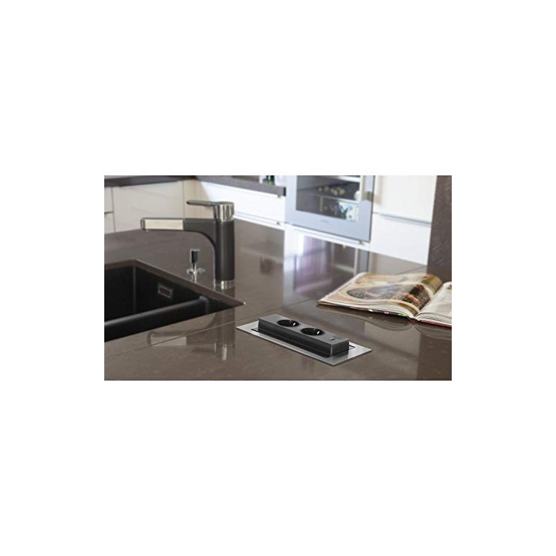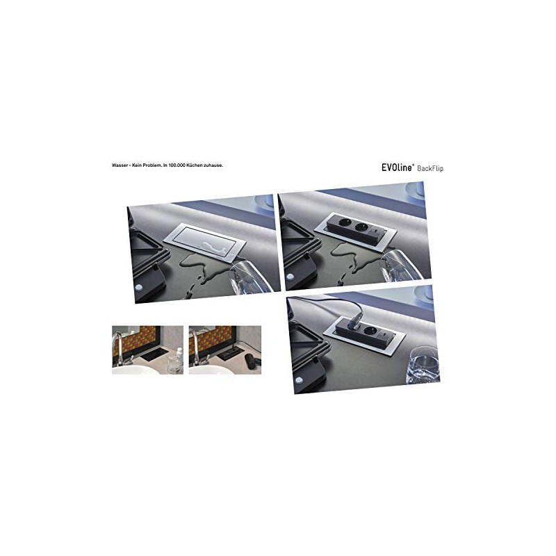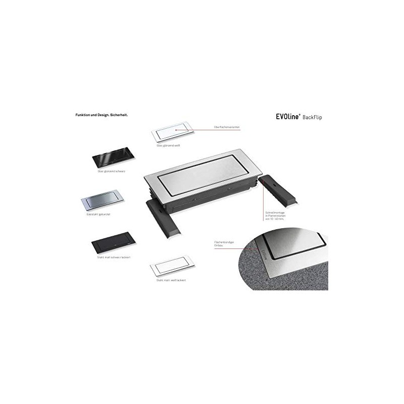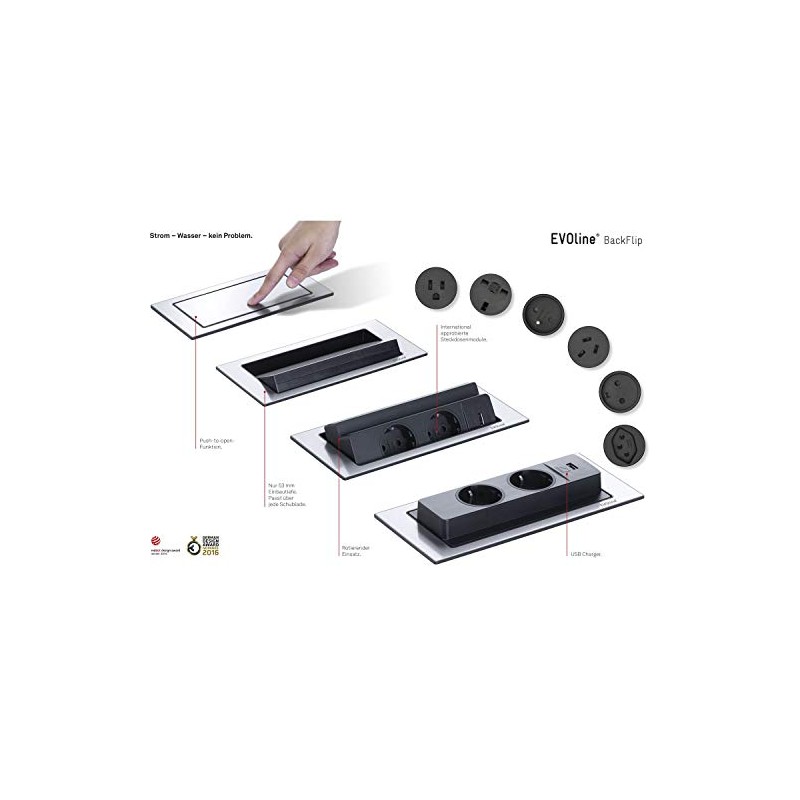 Immer verf1gbar, aber nie im Weg. Geschlossen ist EVOline BackFlip nur eine d1nne Platte auf der Arbeitsfl?che. Mit einem Finger angetippt dreht er sich um 180?? und zeigt seine n1tzliche Seite. Steckdosen und USB-Charger liegen erh?ht und sind vor Wasser gesch1tzt. Integrierter USB-Charger zum Aufladen von Ger?ten mit USB-Anschluss (z.B. Smartphones und Tablet-PC, ....). Geringe Einbautiefe (53mm) daher f1r den Einbau 1ber Schubladen geeignet. F1r Plattenst?rke bis 40 mm. EVOline BackFlip kann auch fl?chenb1ndig verbaut werden und dennoch bleiben die Steckdosen in ge?ffnetem Zustand erh?ht. Lieferumfang: Netzstecker lose beigelegt.