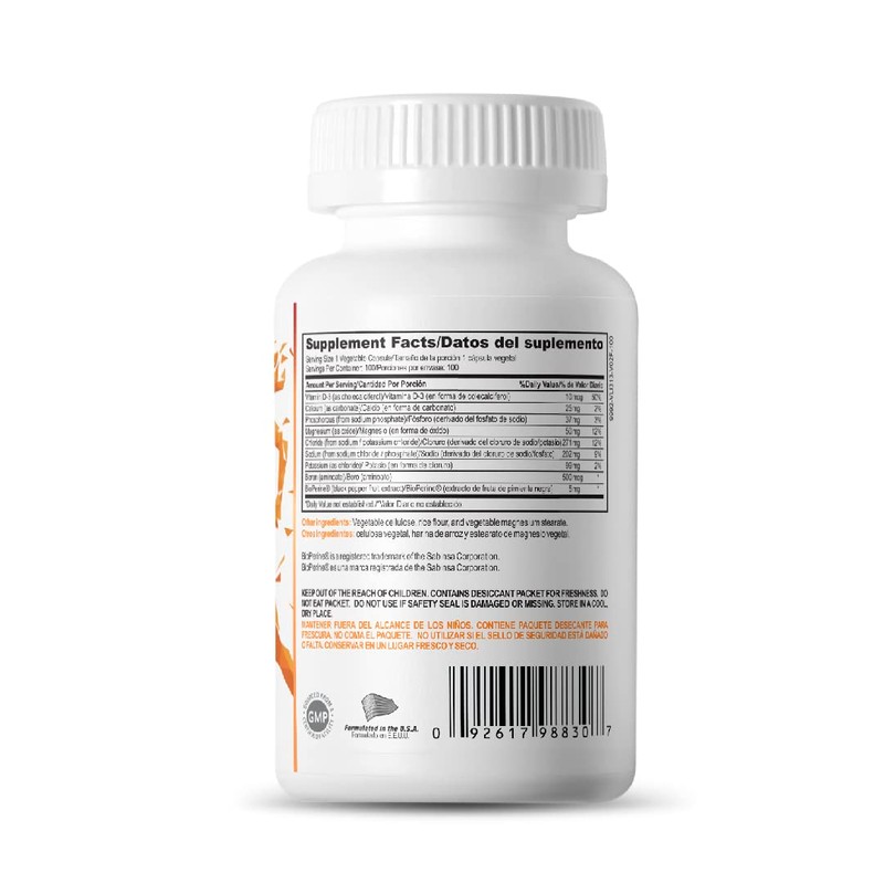 - INGREDIENTS - Electrolytes, Bioperine, boron. Because it contains boron and Bioperine, two ingredients that increase absorption, you will feel its benefits very quickly. It also includes Vitamin D-3, Potassium, Calcium and Magnesium. Non-GMO and Veggie Capsules
