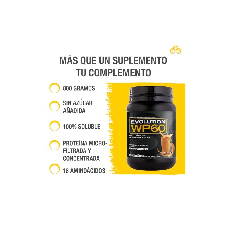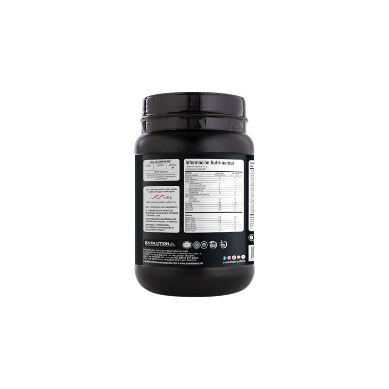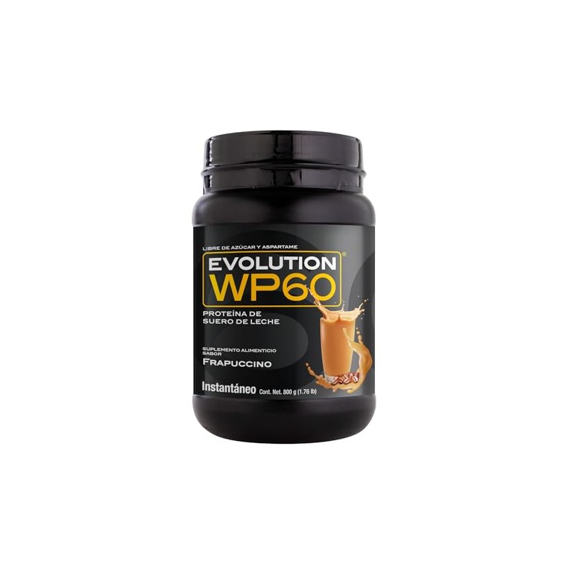 Acerca de este artículo PROTEÍNA DE SUERO DE LECHE. La proteína WP60 sabor Frapuccino de Evolution, es una mezcla de proteína concentrada y microfiltrada de suero de leche. Contiene todos los aminoácidos, tanto los esenciales como los no esenciales, vitaminas y minerales CARACTERÍSTICAS. La fórmula especializada y exclusiva de Evolution es muy baja en sodio y es altamente soluble. Está hecha con café instantáneo y saborizante natural. Sin azúcar añadida USO RECOMENDADO. Se recomienda tomarla diluida en 350 ml de agua o leche, después del ejercicio. Ideal para tomarse después del entrenamiento, ya que ayuda a la recuperación post ejercicio. Brinda 18 g de proteína y 7.5 g de hidratos de carbono por porción CERTIFICACIONES. Contamos con certificaciones nacionales e internacionales. Este producto no es un medicamento. El consumo de este producto es responsabilidad de quien lo recomienda y de quien lo usa. No se recomienda tomarla durante el embarazo y lactancia NUEVA IMAGEN EVOLUTION. Seguimos evolucionando para tu bienestar. Por ello, decidimos rediseñar nuestra imagen. Es posible que en tu próximo pedido recibas el producto con la imagen anterior, o mejor aún, con nuestra nueva imagen y la calidad de siempre EVOLUTION. Es una empresa mexicana con más de 10 años de experiencia en el mercado de nutrición deportiva y wellness. Gracias a su determinación, certificaciones, compromiso y visión, se ha posicionado como una de las líneas más completas de suplementos alimenticios en el mercado mexicano