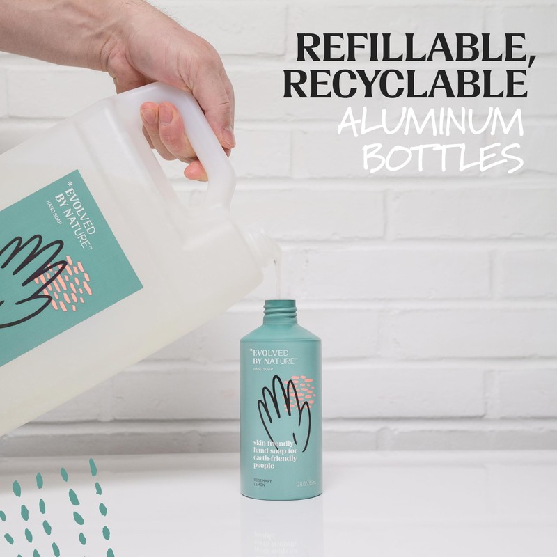 - MINIMIZES WASTE: Our soap dispensers are made of recyclable, reusable aluminum that can be refilled with our bulk hand soap that comes in recyclable 1 gallon (128 oz) jugs, filling 12 oz kitchen and bathroom soap dispensers 10 times