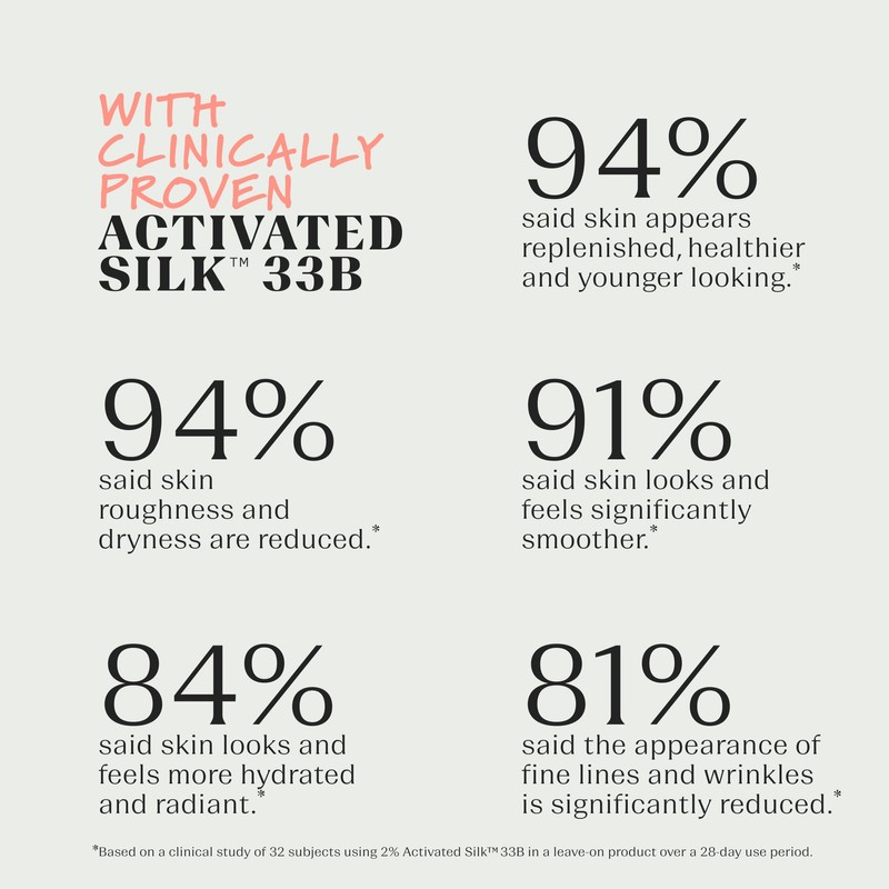 - CLINICALLY PROVEN: Reduces roughness, dryness, and the appearance of fine lines, for skin that looks and feels more smooth, radiant, healthy and hydrated. (Based on a clinical study of 32 subjects using 2% Activated Silk 33B in a leave-on product over a 28-day use period.)