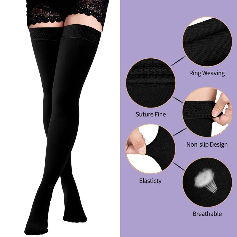 - Effective Therapy: Evolyline will bring you well-designed thigh high compression socks for flying that provide graduated compression from heel to thigh. Therapeutic compression stockings promote blood circulation and help relieve tired legs. Great for treating varicose and spider veins, diabetes support, long time flighting and general swelling or inflammation of the legs and feet.